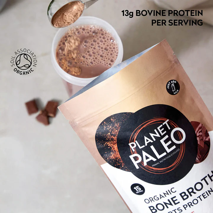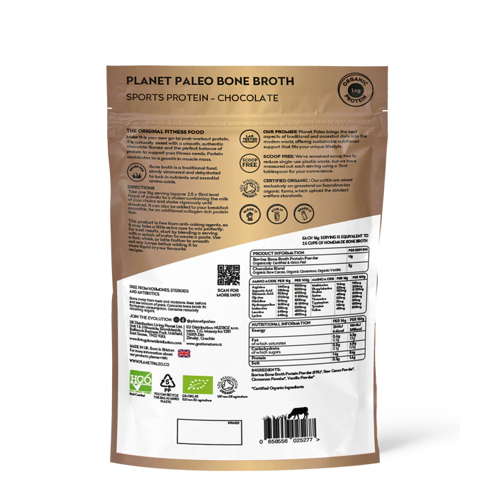 Planet Paleo Organic Bone Broth protein is crafted from the highest quality Organic grass-fed cattle in Scandinavia, slowly simmered to release all the powerful primal nutrients, and dehydrated into a convenient, easy to use form.