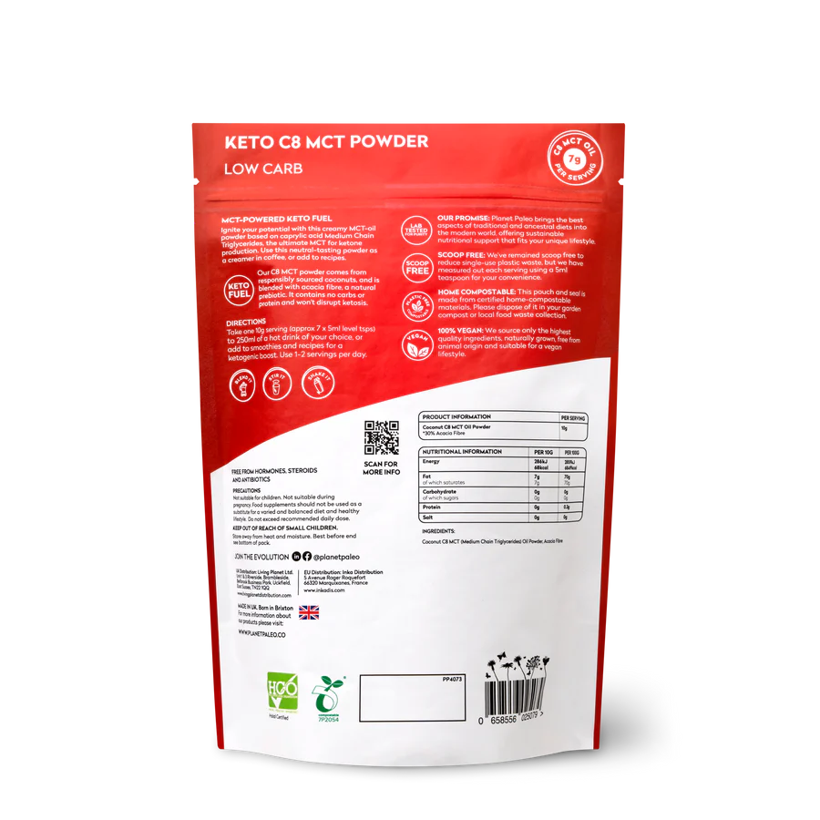 Take one 10g serving (approx 7 x 5ml level tsps) to 250ml of a hot drink of your choice, or add to smoothies and recipes for a ketogenic boost. Use 1-2 servings per day.