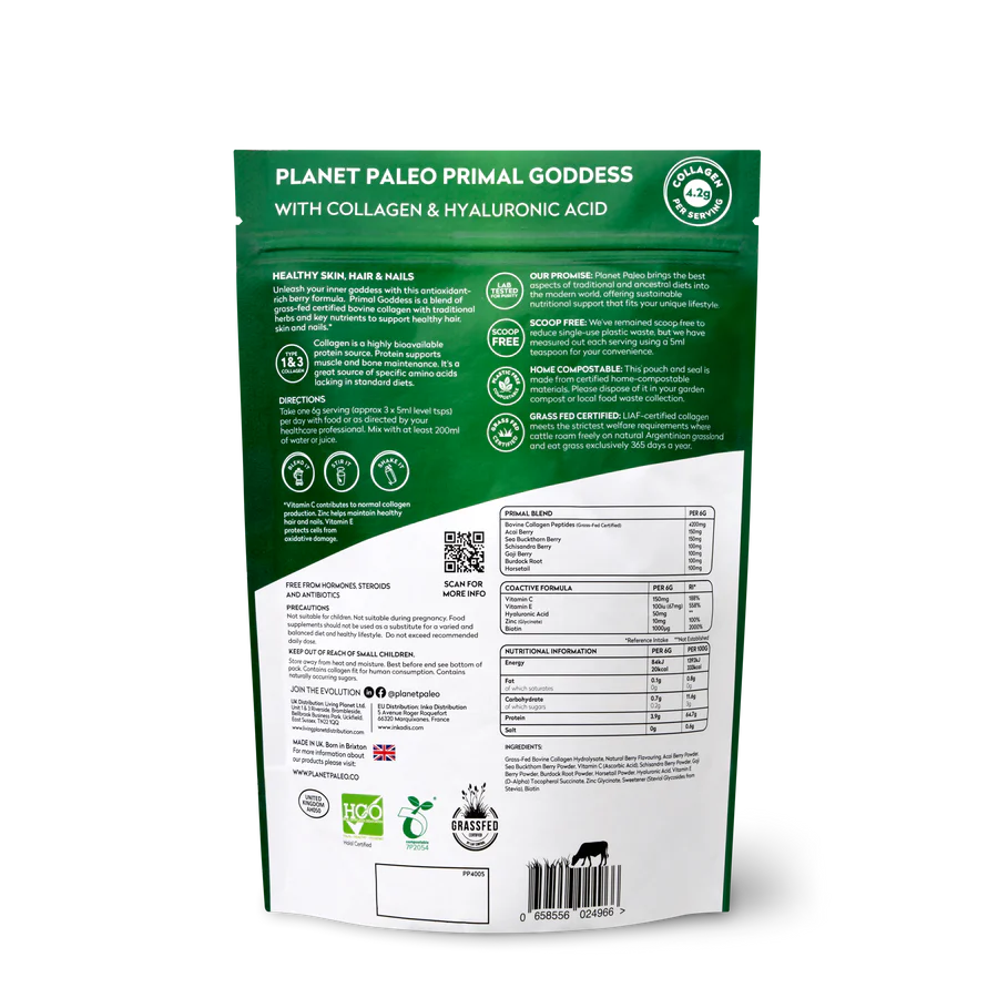 Planet Paleo Primal Goddess collagen powder is a carefully chosen blend of primal herbs, scientifically researched co-active nutrients and collagen peptides.