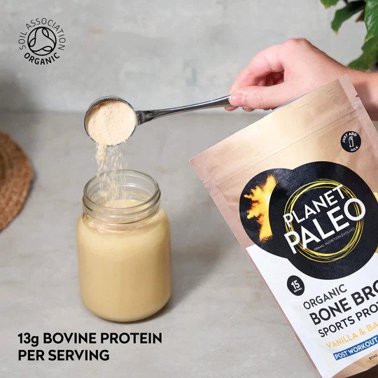 Planet Paleo Organic Bone Broth Sports Protein is crafted from the highest quality Organic grass-fed cattle in Scandinavia, slowly simmered to release all the powerful primal nutrients, and dehydrated into a convenient, easy to use form.